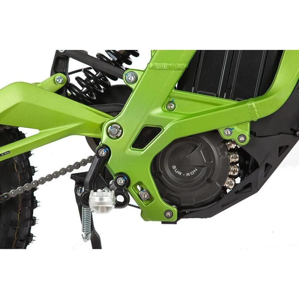 Электропитбайк SUR RON X в зелёной расцветке создан для быстрой езды по дорогам. Он спокойно проедет по грунтовой дороге, не застрянет в песке и ему не страшны горки.