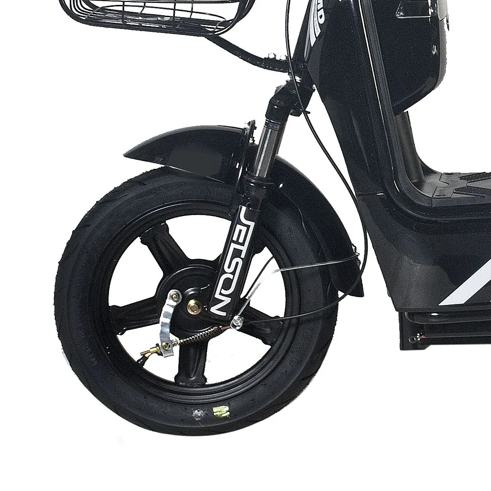 Электроскутер Jetson RS-12 – двухместный городской электроскутер, ориентированный на максимальный комфорт пользователя. Это понятно уже с комплекта – с завода к скутеру идёт корзинка для перевозки личных вещей и удобное сидение с прямой спинкой для пассажира. Интерфейс скутера интуитивно понятен, ручки тормоза выполнены в анатомической форме, а грипса ручки газа сделана из нескользящего материала, что повышает безопасность поездки. 14-дюймовые колёса электроскутера Jetson RS-12 имеют высоко профильные покрышки, которые без труда проезжают по самым худшим неровностям. Кроме того колёса накрыты полноразмерными крыльями, защищающими водителя и пассажира от грязи и брызг во время движения. Мощная LED-лампа и задний ходовой фонарь делают скутер заметным даже в самое тёмное время суток. Электромотор скутера наделён 350 Ваттами мощности, что позволяет разогнать скутер до 40 км/ч. А быстросъёмный свинцовый аккумулятор ёмкостью 12 Ач делает возможным преодоление 50 километров без подзарядки скутера. Приятным бонусом ко всему является сигнализация, идущая к Jetson RS-12 в комплекте, как и зарядное устройство.