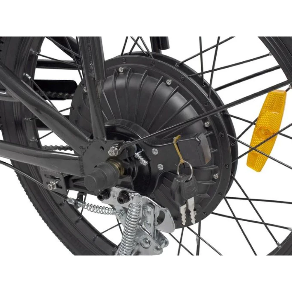 При максимальной грузоподъемности 130 кг и параметрах электродвижка 350 Вт скоростные параметры достигают 25 км/час, а максимальный запас хода составляет 45 км. Батарея емкостью 12 А*ч размещена за подседельной трубке в специальном защитном блоке. АКБ быстро заряжается, относится к категории быстро съемных элементов.