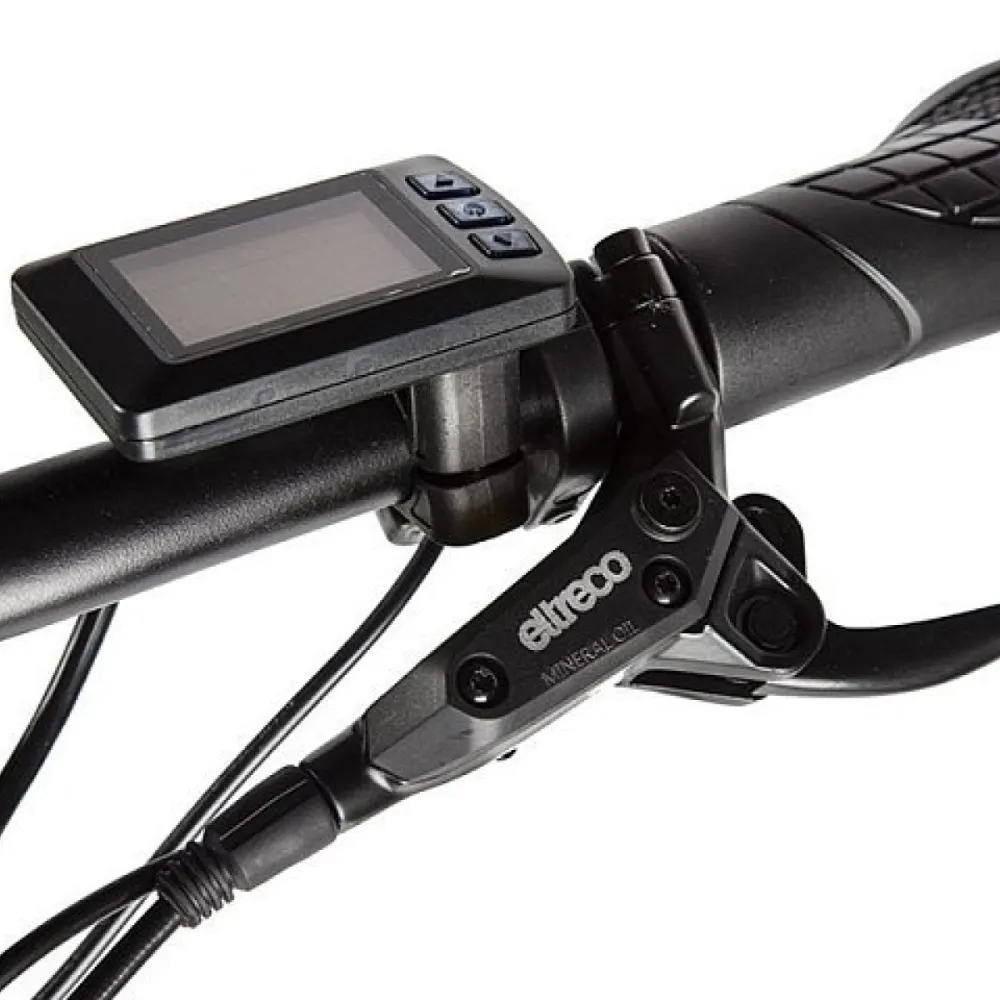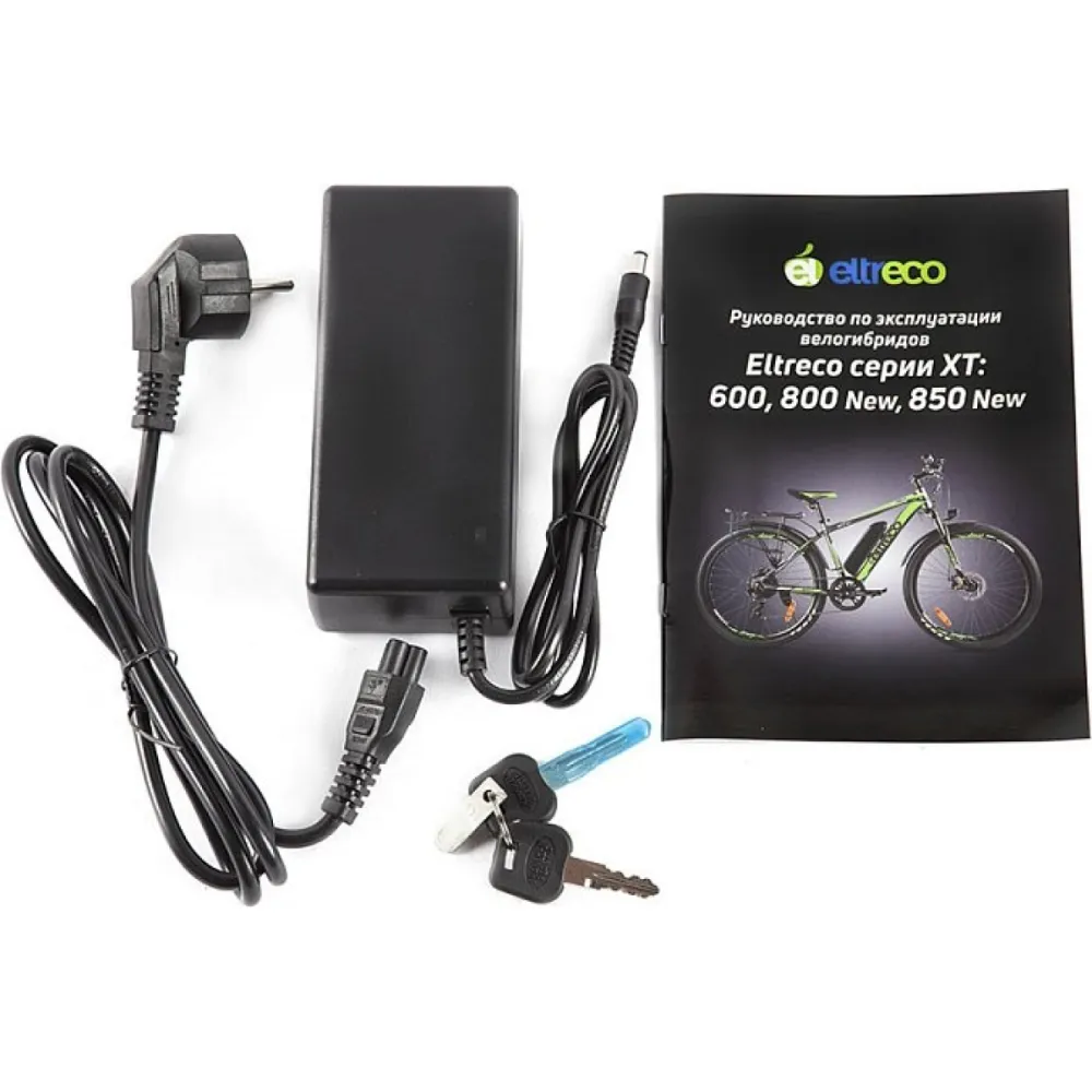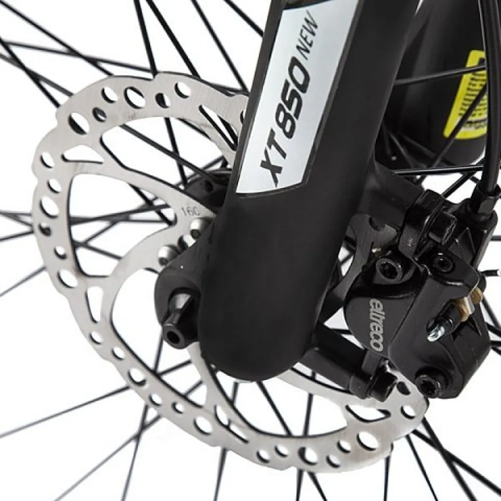 Колеса на Eltreco XT 850 new по размеру 27,5 дюйма. Такой диаметр колеса обеспечивает комфортное движение даже при неровностях и препятствиях. На переднем колесе установлен эксцентрик, поэтому его легко снять с вилки для удобства транспортировки. Имеется амортизирующая подвеска.