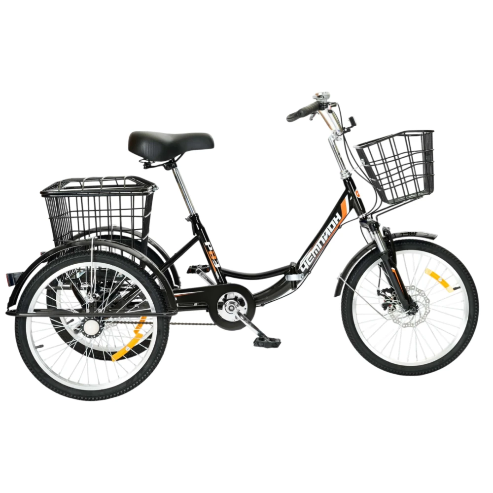 Велосипед РВЗ Чемпион 20 складной — надёжный трёхколёсный вариант для взрослых с устойчивостью и удобством хранения. Он идеален для повседневных поездок и перевозки грузов благодаря корзинам и нагрузке до 170 кг.